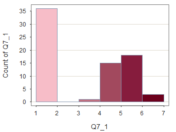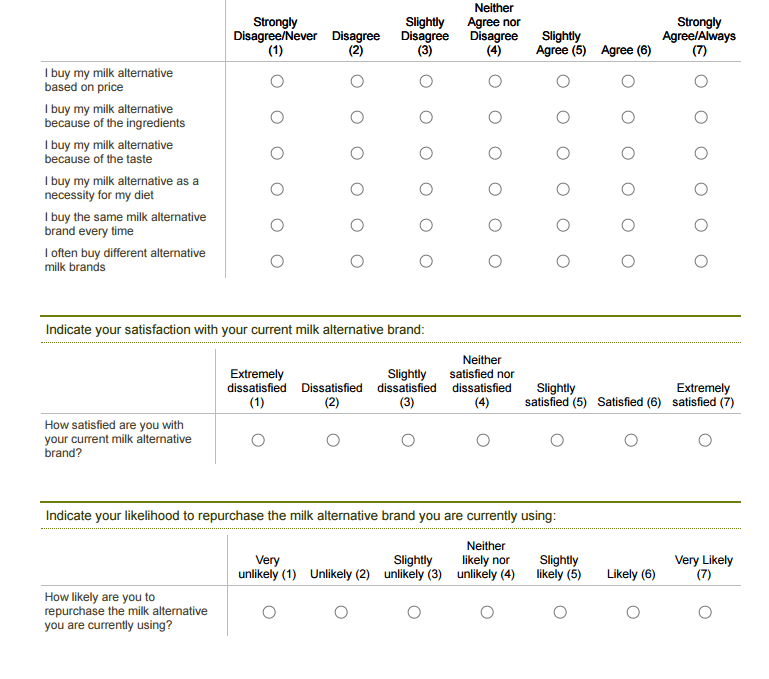 Next I focused on the product; why are people purchasing their milk alternative? Utilizing a Likert Scale to quantify attitudes and behaviors, I asked a series of questions on a scale of 1-7 and I inquired to consumers level of satisfaction with their current milk alternative brand: