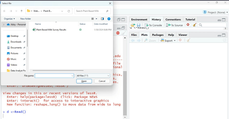 First I load the lessR library and read my data (results from the survey populated in a .csv file) into R.