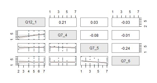 Q7_4 appears to be the most relevant variable, with the highest correlation with the target Q12_1 of 0.20, so it is the most likely predictor variable to remain in the final model.